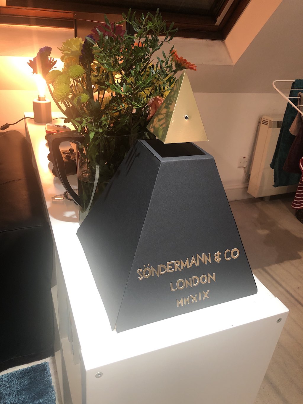 At around the same time, I saw a grand piano somewhere and decided I wanted to use that polished black/gold aesthetic for my machine. Since I started thinking about wood and metal, I came up with the idea of using a grid of mechanic flip switches to enter a passphrase. I still think this would be very cool but didn’t have enough time in the end to build it. The shape I had settled on by then was that of a pyramid and after seeing the pyramid on the back of a dollar bill I had brought back from a trip to the US for some dollar origami, I eventually decided to put a camera in the tip of the pyramid and use QR codes as passphrases. The writing on the front of the pyramid is inspired by a picture of a Bösendorfer grand piano I found online. I tried to make the golden tip of the pyramid look like it floated the way it does on the dollar.